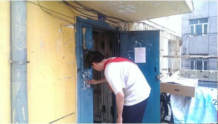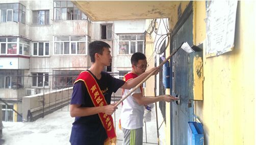 早上八点,同学们到达了南岗区花园社区居委会,由马阿姨来为大家安排工作:这一次是清理社区楼道与墙体周边的小广告。小分队的7名同学都领到了壁纸刀、喷壶等工具。在清理过程中,虽然天气阴冷,淅沥沥的雨下在同学们身上,但大家都充满着劳动的热情,丝毫不减退。楼体的小广告许多都用不干胶粘贴,给大家的清理带来了很大的麻烦,但同学们齐心协力,认真地清理掉每一块“牛皮癣”,还社区优美的环境。遇到了工作量较大的楼道,在团支书的安排下,大家分工合作,逐层清理,也取得了较高的效率。社区的老人对志愿者说:“孩子们辛苦了,谢谢你们”。听到了社区居民的这句话,是对我们劳动的肯定,让我们更加充满干劲。一上午的时间,志愿者们清理完成了整栋楼的小广告。