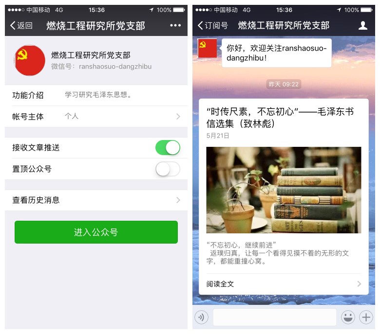 活动开展之初,由党支部宣传委员创建燃烧工程研究所微信公众平台,并在线下进行平台推广。在不定期推送每一篇推文我们播送一篇声情并茂的朗读书信,配原文另附一段诗词呼应。短短数天,便有众多同学关注我们的平台