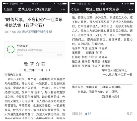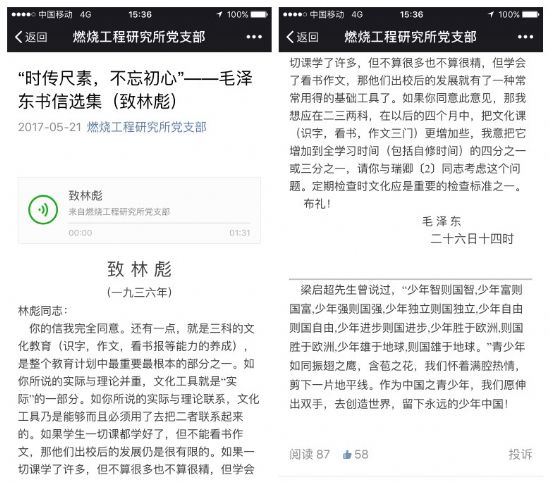 推送内容确定以后,在党内征集了两位志愿党员,以朗读的形式录制了毛泽东同志的书信手稿翻本。用这种极具渲染力的方式,借助文字和声音力量,传递出毛泽东同志对待教育的观点看法以及为求国共两党联合抗日所表露出的真知灼见