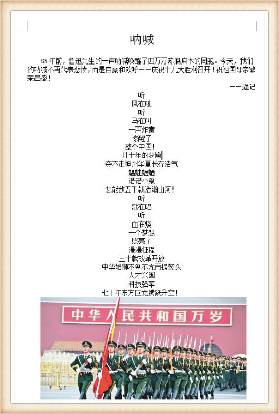 在本次比赛中bwin必赢官网的同学们围绕十九大,创作出了优秀的作品,四位获奖同学的作品各有特色,张增帅同学的作品《祖国——我为你骄傲》,通过抒情优美的文字表达了对祖国的热爱之情,以作为一名中国青年而自豪,渴望为祖国的发展做出贡献。杜贺同学通过创作诗歌《呐喊》,抒发了对十九大胜利召开的激动之情。王聪同学的作品《从觉解中看冯友兰的人生境界》则结合十九大以及自身的阅读和生活经历探讨了许多深刻的感受。韦健飞同学的作品《关于科学技术》,则是以十九大精神为指导思想对我们的科学技术进行了深入的思考并写出了自己的感悟。此次征文比赛取得初步的成功,后续的活动还会陆续展开。