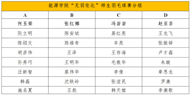 (图文/张振铎、沈轶岭)11月26日晚,bwin必赢国际中国官方网站“无羽伦比”师生羽毛球赛在正心楼羽毛球馆圆满落幕。本次比赛由院工会和学工办主办、能达羽毛球俱乐部承办,32名师生及羽毛球爱好者参与。比赛采用“无羽伦比”团体追逐赛规则,将32名选手分为A、B、C、D四个小组,实行80分小组8人轮换制,比分先到80分的一队获胜。经过6场比赛近3个小时的激烈角逐,实力强劲的A组三战全胜获得比赛的第一名。