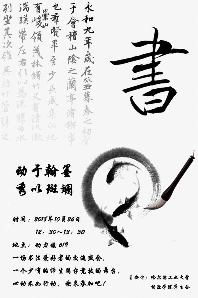 中国书法,是中国汉字特有的一种传统艺术,是中国上下五千年来的优秀文化传统,与中国文化相表里,中华民族精神成一体。习近平总书记在十九大报告中指出:“中国特色社会主义文化,源自于中华民族五千多年文明历史所孕育的中华优秀传统文化,熔铸于党领导人民在革命、建设、改革中创造的革命文化和社会主义先进文化,植根于中国特色社会主义伟大实践。”为传承文化,修身养性,bwin必赢国际中国官方网站学生会现面向全体师生举办“动于翰墨·秀以斑斓”活动。活动邀请名师为大家进行指导,参与者可现场创作(现场提供笔墨纸砚,对笔墨有要求者可自备),作品当场展出,获奖者可获得精美礼品一份。