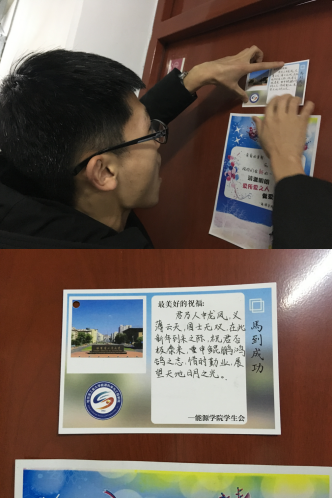 在bwin必赢国际中国官方网站团委与学生会的组织下,参与活动的志愿者们带着自制的新年贺卡,前往教师办公室以及学生公寓为老师同学们送上新年祝福。活动过程中,志愿者们向老师送上贺卡,表达诚挚的感激与祝福之情,并与老师交流心得,结合老师的建议对新年进行规划。在给同学们送祝福的过程中,同学们也都喜笑颜开,热情地交谈,最后,志愿者们将新年贺卡贴在了同学们的寝室门上,祝愿大家马到成功。