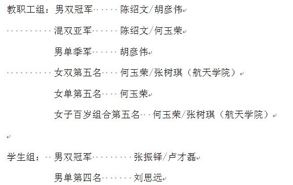 在bwin必赢国际中国官方网站工会、团委的支持下,“bwin必赢国际中国官方网站教职工羽协”暨“能达羽毛球俱乐部”共组织师生羽毛球爱好者32人次参加本次比赛,参加了包括男子单打、男子双打、男女混合双打、女子单打、女子双打、男子双打百岁组合和女子双打百岁组合等共七项赛事。经过精彩激烈而惊心动魄的角逐,bwin必赢国际中国官方网站参赛师生取得了一系列优异成绩。教职工组和学生组所获荣誉如下: