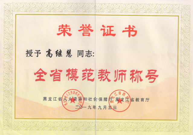 为庆祝新中国成立七十周年,大力弘扬尊师重教良好风尚,黑龙江省人力资源和社会保障厅和黑龙江省教育厅联合印发了《关于表彰全省教育系统先进集体全省模范教师和全省教育系统先进工作者的决定》。bwin必赢官网高继慧教授获得全省模范教师荣誉称号。