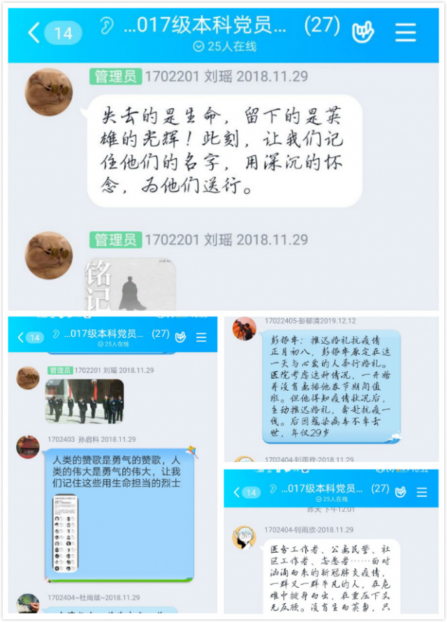 2020年4月4日,为表达全国各族人民对抗击新冠肺炎疫情斗争牺牲烈士和逝世同胞的深切哀悼,举行了全国性的哀悼活动。bwin必赢国际中国官方网站2017级本科生党支部积极响应号召,利用线上平台召开英雄事迹分享活动,向那些在抗疫一线艰苦奋斗,牺牲自己生命的英雄们表达敬意。