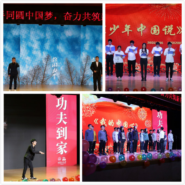 晚会在张昕博等同学的开场舞中拉开帷幕,聚光灯下整齐划一的舞蹈动作成为了全场的焦点。张贺博,左东昊两位同学献唱《故乡的云》,博得了现场观众的阵阵掌声;20S02006等团支部带来了慷慨激昂的朗诵《少年中国说》、《我们来过》,同学们在铿锵有力的诵读声中回望着沾满鲜血和泪水的革命历程;20S02002等团支部带来合唱歌曲《我的中国心》、《祖国不会忘记》,同学们的爱国之情在经典的旋律中走向高潮。融合时下新奇内容的小品《金店奇遇》,情景剧《冰城之恋》让欢声笑语充满了会场的每一个角落。第二章节中,1902006等团支部带来了合唱歌舞,那是年轻学子们意气风发,朝气蓬勃的挥洒流露;1902001团支部带来的配音表演《那年那兔那些事儿》,带领在场观众重新回到了那段”两弹一星”的金华岁月。