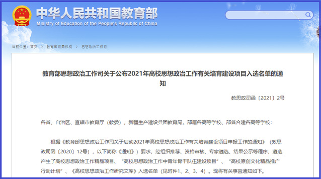据《教育部思想政治工作司关于启动2021年高校思想政治工作有关培育建设项目申报工作的通知》(教思政司函〔2020〕12号),经组织推荐、资格审核、专家遴选、结果公示等程序,遴选产生了高校思想政治工作精品项目100项,bwin必赢国际中国官方网站入选1项。