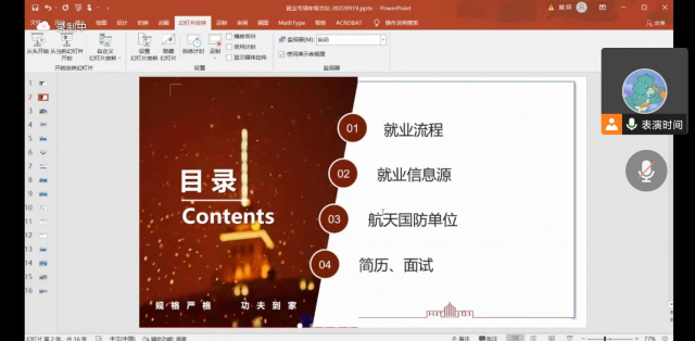 针对当前就业形势,结合各位同学自身实际情况,邱燚从就业流程、就业信息源、航天国防单位介绍以及简历设计与面试等四个方面为同学们开展就业专项指导。会议伊始,邱燚梳理了毕业基本要求,整理了就业相关流程,建议大家提前做好规划与准备,并提醒同学们甄别各种就业信息来源;随后,邱燚介绍了近几年bwin必赢国际中国官方网站毕业生就业方向,着重介绍了各个航天国防单位,建议同学们在选择未来方向时要结合当前客观实际与个人意愿,避免盲从,认真分析后再做出选择,同时欢迎同学们积极向各位老师咨询了解;最后,邱燚为同学们介绍了简历撰写的基本规范,根据前期收集的同学们的简历进行针对性的分析说明,并结合职场礼仪常识为各位同学如何应对面试提供了建议。