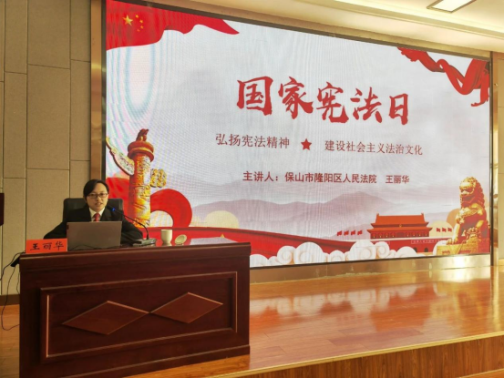 讲座由隆阳区人民法院立案庭庭长王丽华法官主讲。王丽华紧扣《弘扬宪法精神,建设社会主义法治文化》的主题,围绕“宪法是什么?我国宪法的发展历程,国家宪法日概述,我们身边的违宪案例”四个内容,结合学生的年龄特点和认知能力,用通俗易懂的语言,通过以案释法的方式,教育引导学生们维护宪法权威,弘扬宪法精神,接受宪法指引,加强宪法学习,践行宪法要求。