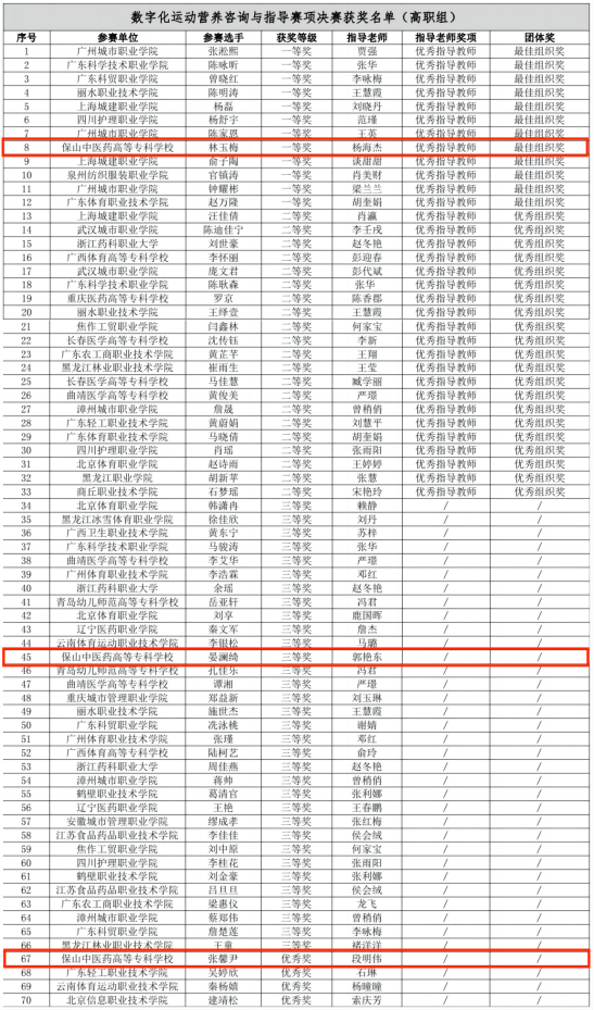 据悉,本项赛事以数字化职业技能竞赛模式为主,共吸引来自全国23个省、自治区、直辖市的196支队伍参赛,其中高职111支,职工58支,中职27支。比赛以数字化技能应用为导向,分理论赛、方案赛、技能赛三项赛程,紧密围绕运动营养产业发展需求设计竞赛内容,综合考察参赛选手专业知识、创新能力和技术应用能力。经过为期4天的激烈角逐,beat365官方网站基础医学院学生林玉梅荣获高职组一等奖、晏澜绮荣获高职组三等奖、张馨尹荣获高职组优秀奖;教师杨海杰荣获高职组优秀指导教师、学校荣获团体最佳组织奖。