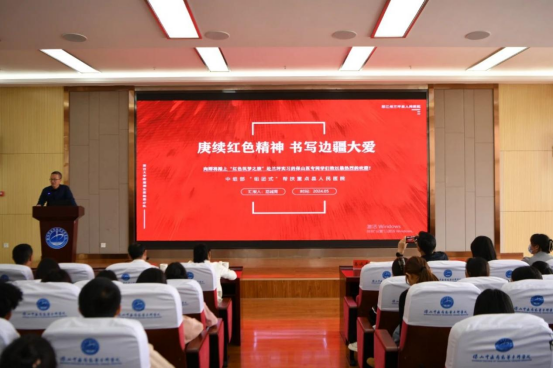 易诚青以“赓续红色精神 书写边疆大爱”为题,围绕“信念”“奉献”“飞扬”“攀登”四个方面内容,讲述作为中组部“组团式”帮扶干部在兰坪奋斗的经历,勉励广大青年学子要立志高远、善积跬步、不懈奋斗,坚定新时代医学生的理想信念,扎根边疆,服务基层。
