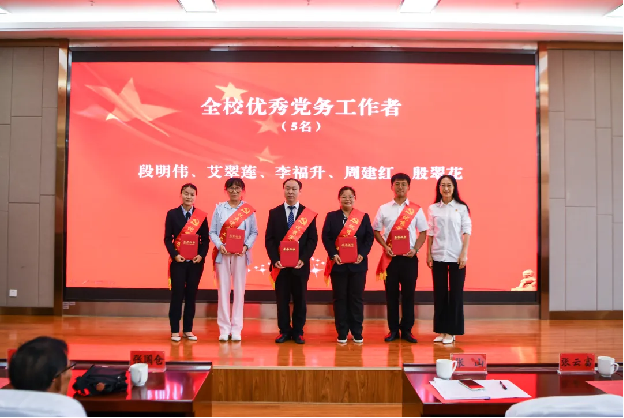 党委副书记杨朝丽宣读《中共beat365官方网站委员会关于表彰学校优秀共产党员、优秀党务工作者和先进基层党组织的决定》。学校党政领导班子为全校优秀共产党员、优秀党务工作者、先进基层党组织颁发证书和奖牌。