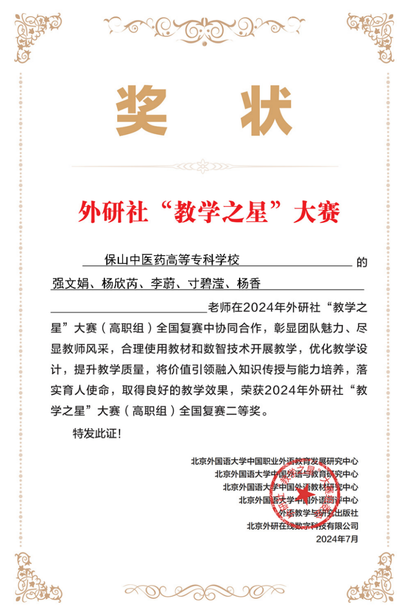 近日,由外语教学与研究出版社主办的2024年外研社“教学之星”大赛全国复赛成绩公布,学校参赛团队荣获(高职组)二等奖。