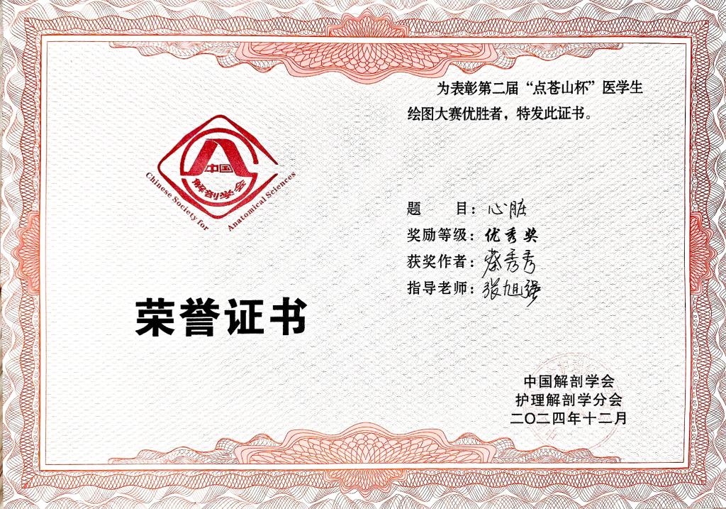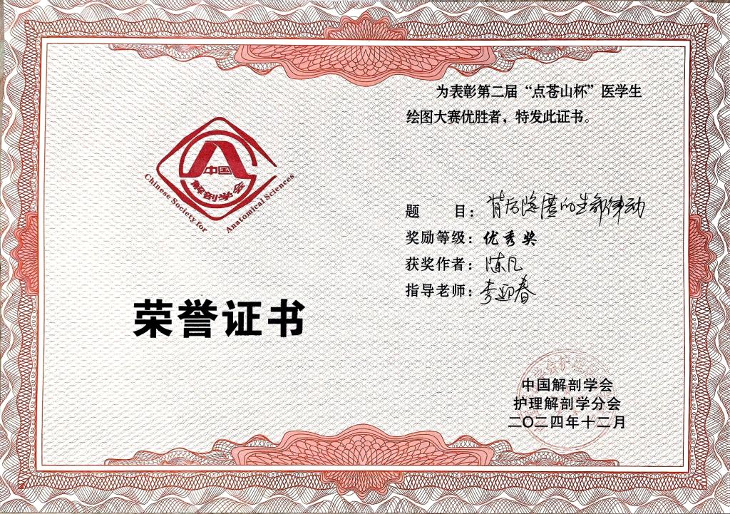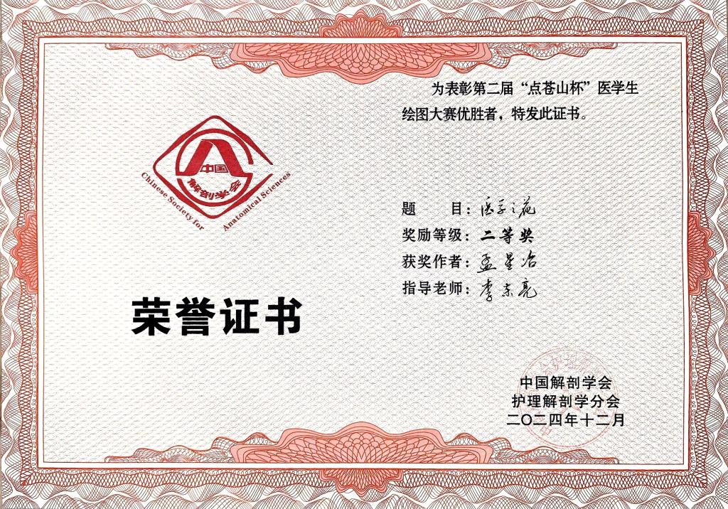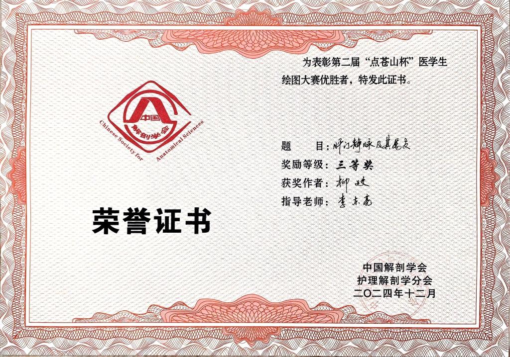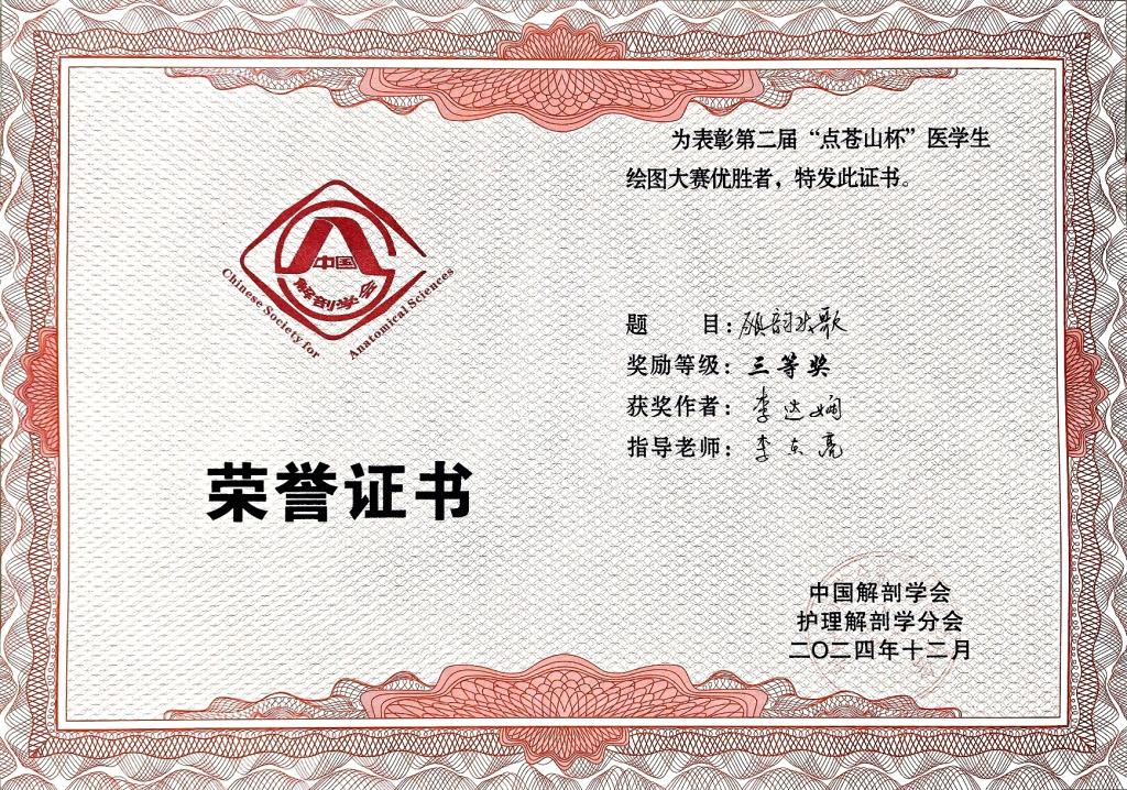 近日,在大理大学举行的2024年点苍山解剖学论坛公布了“点苍山杯”医学生解剖学绘图大赛获奖名单。我校学生参赛作品获一等奖1项,二等奖1项,三等奖3项,优秀奖2项。