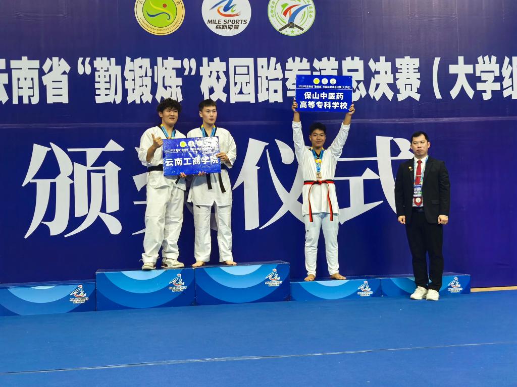 近日,由云南省教育厅主办,弥勒市教育体育局承办的2025年云南省“勤锻炼”校园跆拳道总决赛(大学组)圆满落幕。学校2024级针推1班李彬获男子乙组铜牌,2025级中医2班胡继粉获女子乙组铜牌,2024级临床5班缪素婕获女子乙组第五名。