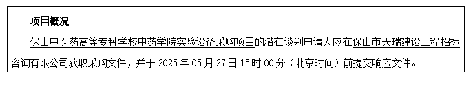 注:1.谈判保证金的缴纳:谈判申请人缴纳谈判保证金须从单位基本户对公账户转出,并注明项目名称或采购编号。 2.谈判保证金的退还:在成交公告发布后,请未成交的谈判申请人携带保证金银行存款、汇款证明及开户许可证明到保山市天瑞建设工程招标咨询有限公司办理退保证金手续, 成交的谈判申请人在合同签订后携带合同协议书及保证金相关凭证退保证金。 |