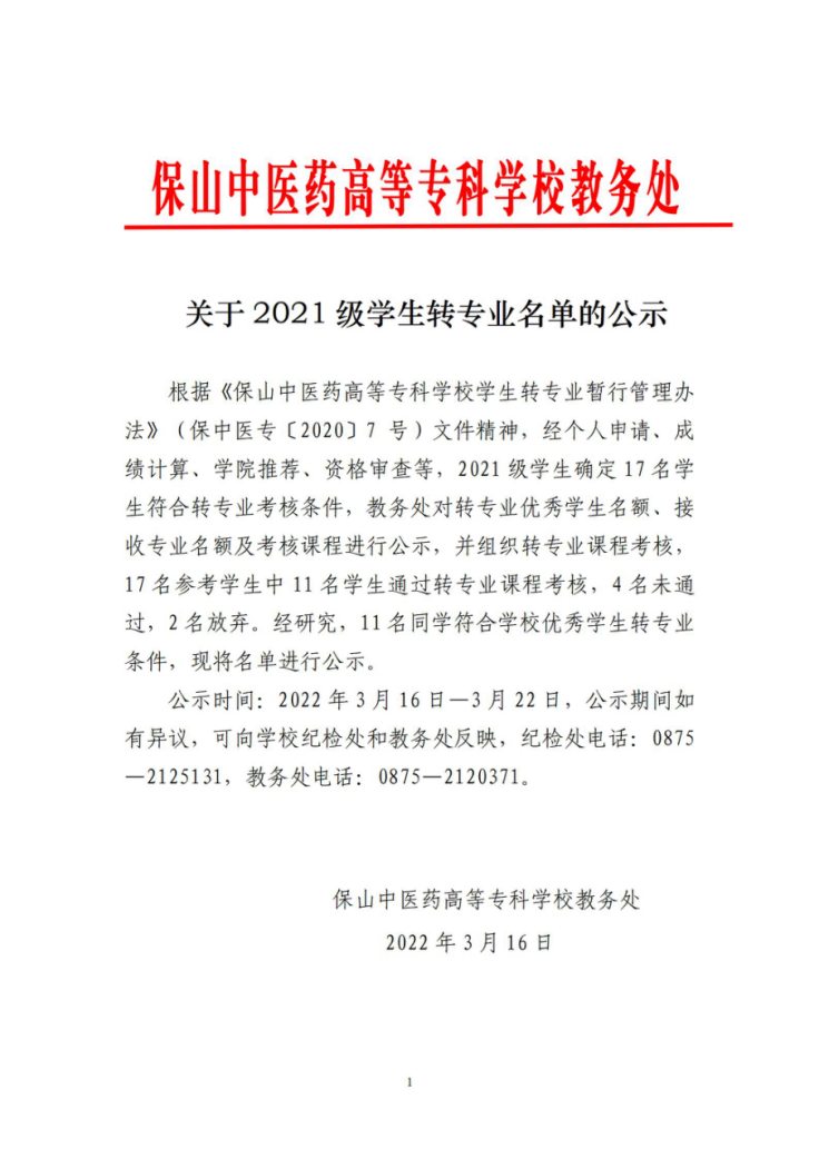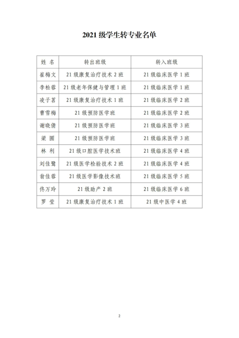 关于2021级学生转专业名单的公示